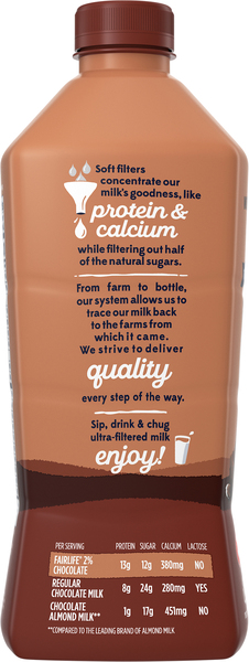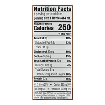 fairlife Yup! 2% Reduced Fat Ultra Filtered Milk Rich Chocolate Nutrition ; Potassium: 330mg 35 ; Total Carbohydrate: 21g 8; Dietary Fiber: 0g 0; Sugars: 21g ; Sugars: 21g ; Protein: 16g ; Calcium: 35.