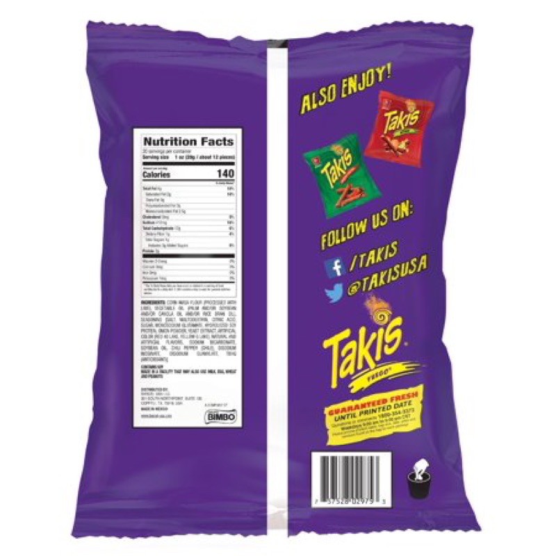 Takis Health, Safety & Nutrition Information | Barcel USA We assure you that Takis are safe to eat, but should be enjoyed in moderation as part of a well-balanced diet. Takis ingredients fully comply with U.S. Food and Drug Administration regulations and all of the ingredients in each flavor are listed in detail on the label. Always check the serving size before snacking. Takis Nutrition Facts & Calories - Inlivo KEY FACTS. Have high calorie density - this means that the amount of calories you are getting from ...